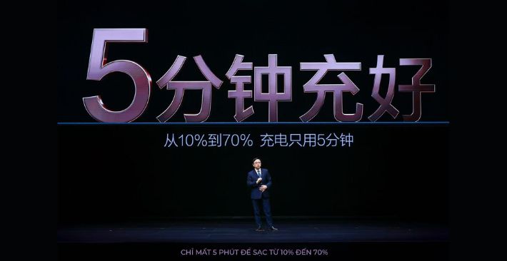 • Sạc từ 10% lên 70% chỉ trong khoảng 5 phút